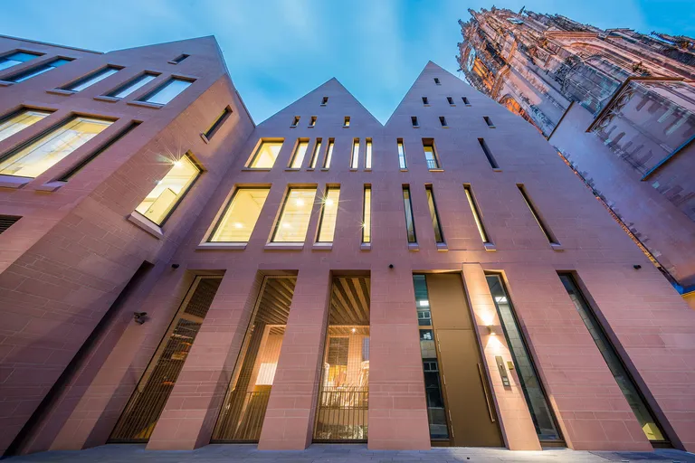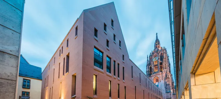 Das Stadthaus, im Herzen der Frankfurter Altstadt gelegen, bezieht seinen Charme aus der historischen Dimension des Ortes: Der Veranstaltungssaal schwebt genau über den verbliebenen Mauern der karolingischen Kaiserpfalz. Durch die Kombination aus traditionellen Materialien, wie der rote Mainsandstein, und den modern anmutenden Messingrauten, schafft das Stadthaus einen harmonischen Übergang zwischen moderner Bebauung und neuer, historisch geprägter Altstadt.